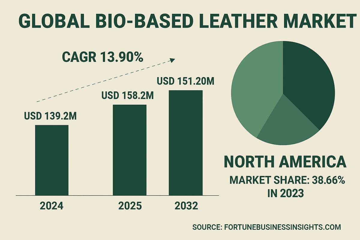 世界の バイオレザー市場規模は、2024年に1億3,920万米ドルと評価されました。市場は予測期間中、2025年の1億5,820万米ドルから2032年には1億5,120万米ドルに拡大し、年平均成長率(CAGR)13.90%で成長すると予測されています。北米は2023年にバイオレザー市場の38.66%のシェアを占め、市場をリードしました。