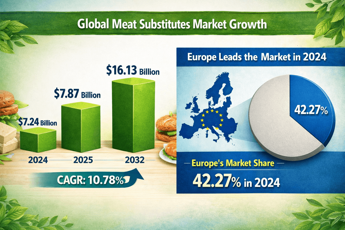 世界の 代替肉市場規模は、2024年には72億4,000万米ドルと推定されました。市場は2025年の78億7,000万米ドルから2032年には161億3,000万米ドルに拡大し、予測期間中に10.78%の年平均成長率(CAGR)で成長すると予測されています。代替肉市場は、2024年にはヨーロッパが42.27%の市場シェアを占め、市場をリードしました。