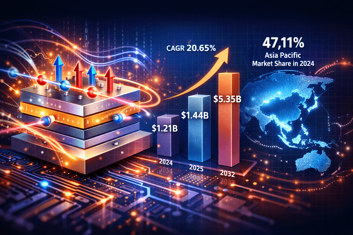 世界の スピントロニクス市場規模は、2024年には12億1,000万米ドルと推定されました。市場規模は2025年の14億4,000万米ドルから2032年には53億5,000万米ドルに拡大し、予測期間中に20.65%の年平均成長率(CAGR)で成長すると予測されています。2024年には、アジア太平洋地域がスピントロニクス市場を47.11%のシェアで支配しました。