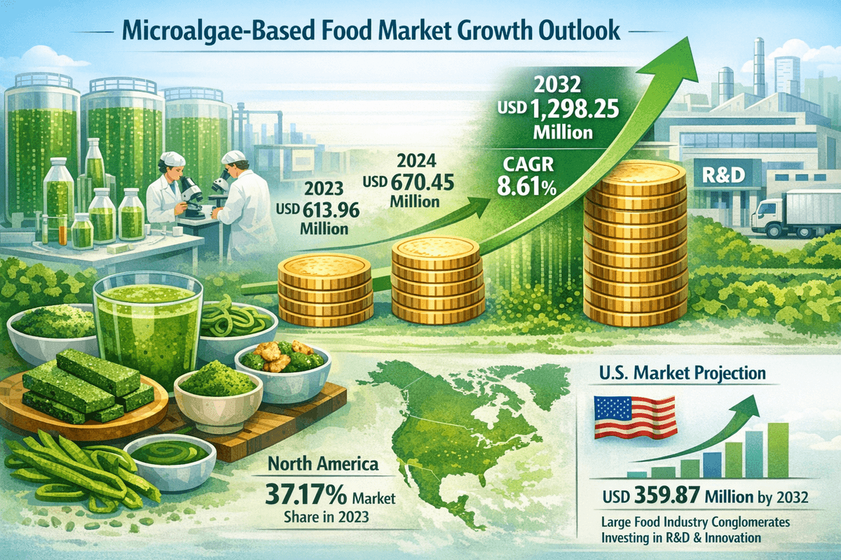 微細藻類由来食品市場は、持続可能な栄養、機能性食品、代替タンパク質への需要の高まりを背景に、予測期間中、着実に成長すると予想されています。研究と商業化への継続的な投資により、用途の拡大と価格の手頃さの向上が期待されます。