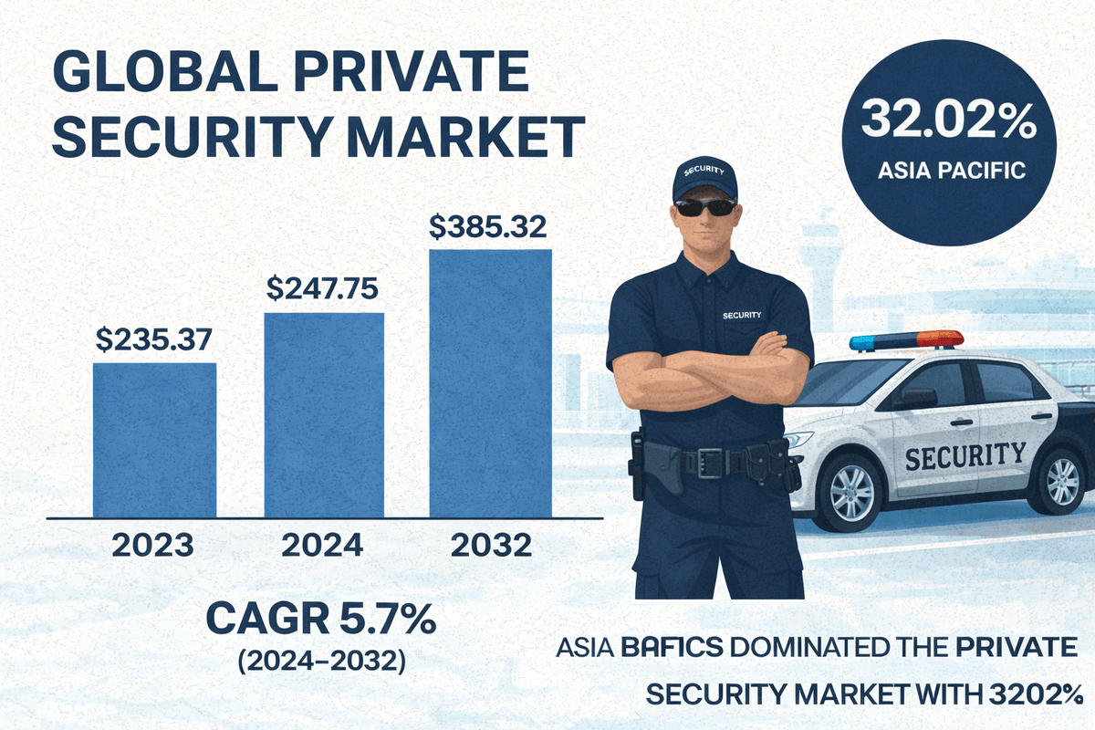 世界の 民間警備市場規模は2023年に2,353.7億米ドルと評価され、2024年の2,477.5億米ドルから2032年には3,853.2億米ドルに拡大すると予測されており、予測期間中は年平均成長率(CAGR)5.7%で成長する見込みです。アジア太平洋地域は2023年に32.02%の市場シェアを獲得し、民間警備市場を牽引しました。