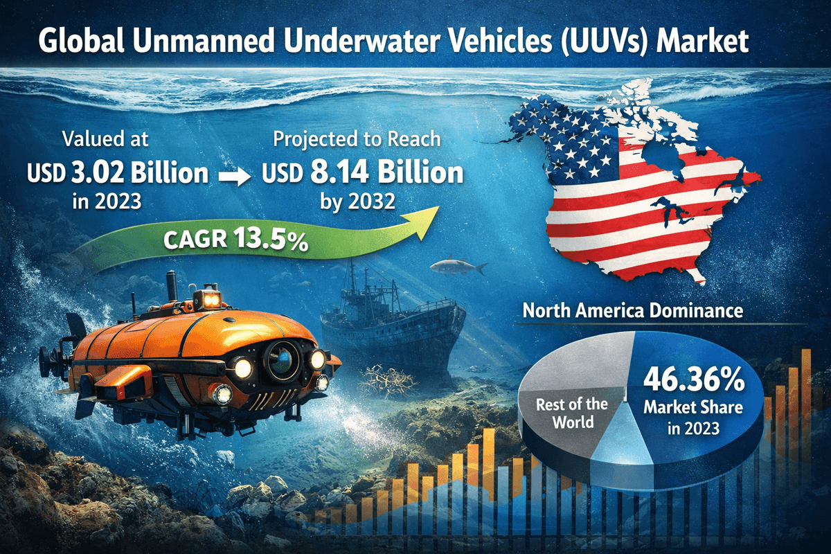 世界の 無人潜水艇(UUV)市場規模は、2023年には30.2億米ドルと評価され、2024年の33.4億米ドルから2032年には81.4億米ドルに拡大すると予測されており、予測期間中は年平均成長率(CAGR)13.5%で成長すると見込まれています。北米は2023年に46.36%の市場シェアを獲得し、UUV市場を牽引しました。