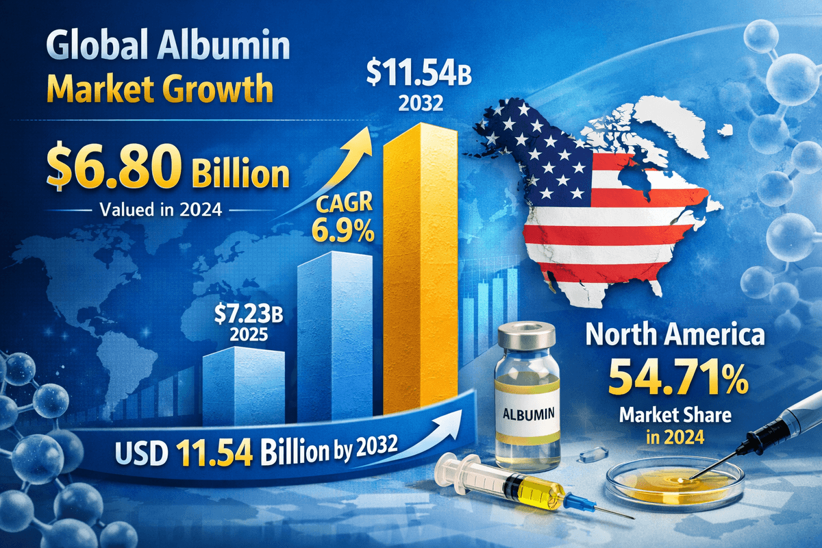 世界のアルブミン市場規模は、2024年には68億米ドルと推定されました。市場は2025年の72億3,000万米ドルから2032年には115億4,000万米ドルに拡大し、予測期間中に6.9%の年平均成長率(CAGR)で成長すると予測されています。北米は2024年のアルブミン市場シェア54.71%で市場を支配しました。