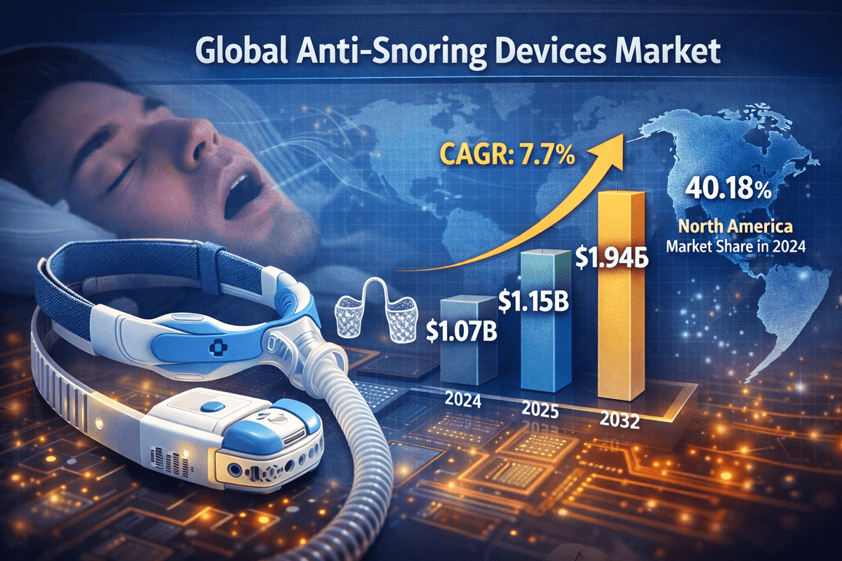 世界の いびき防止装置市場規模は、2024年には10億7,000万米ドルと推定されました。市場規模は2025年の11億5,000万米ドルから2032年には19億4,000万米ドルに拡大し、予測期間中に7.7%の年平均成長率(CAGR)で成長すると予測されています。北米は、2024年にはいびき防止装置市場において40.18%のシェアを占め、市場をリードしました。