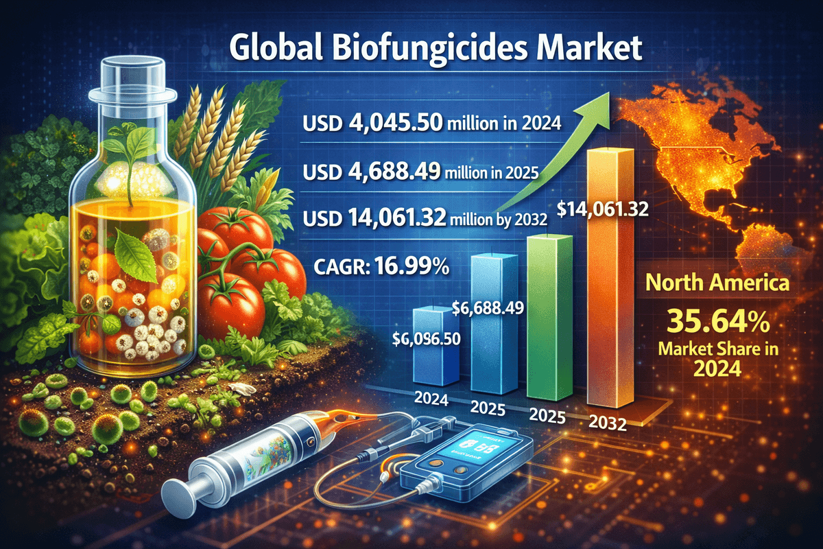世界の バイオ殺菌剤市場 規模は、2024年には40億4,550万米ドルと推定されました。市場は2025年の46億8,849万米ドルから2032年には140億6,132万米ドルに拡大し、予測期間中に16.99%の年平均成長率(CAGR)で成長すると予測されています。北米は2024年のバイオ殺菌剤市場aqシェア35.64%で市場を支配しました。