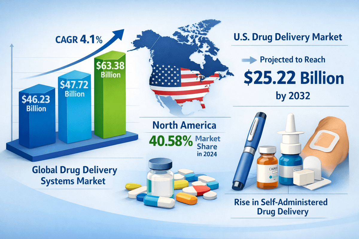 世界の ドラッグデリバリーシステム市場規模は、2024年に462.3億米ドルと評価されました。市場は2025年の477.2億米ドルから2032年には633.8億米ドルに成長し、予測期間中に4.1%の年平均成長率(CAGR)を示すと予測されています。北米は2024年に40.58%の市場シェアを獲得し、ドラッグデリバリーシステム市場を牽引しました。さらに、米国のドラッグデリバリーシステム市場規模は、自己投与型ドラッグデリバリーシステムへの嗜好の変化を背景に、大幅に成長し、2032年には推定252.2億米ドルに達すると予測されています。