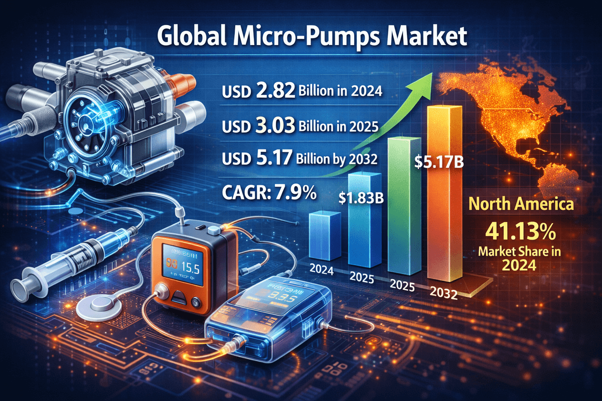 世界の マイクロポンプ市場規模は、2024年には28億2,000万米ドルと評価されました。市場は2025年の30億3,000万米ドルから2032年には51億7,000万米ドルに拡大し、予測期間中に7.9%の年平均成長率(CAGR)で成長すると予測されています。北米は2024年のマイクロポンプ市場シェア41.13%で市場を支配しました。