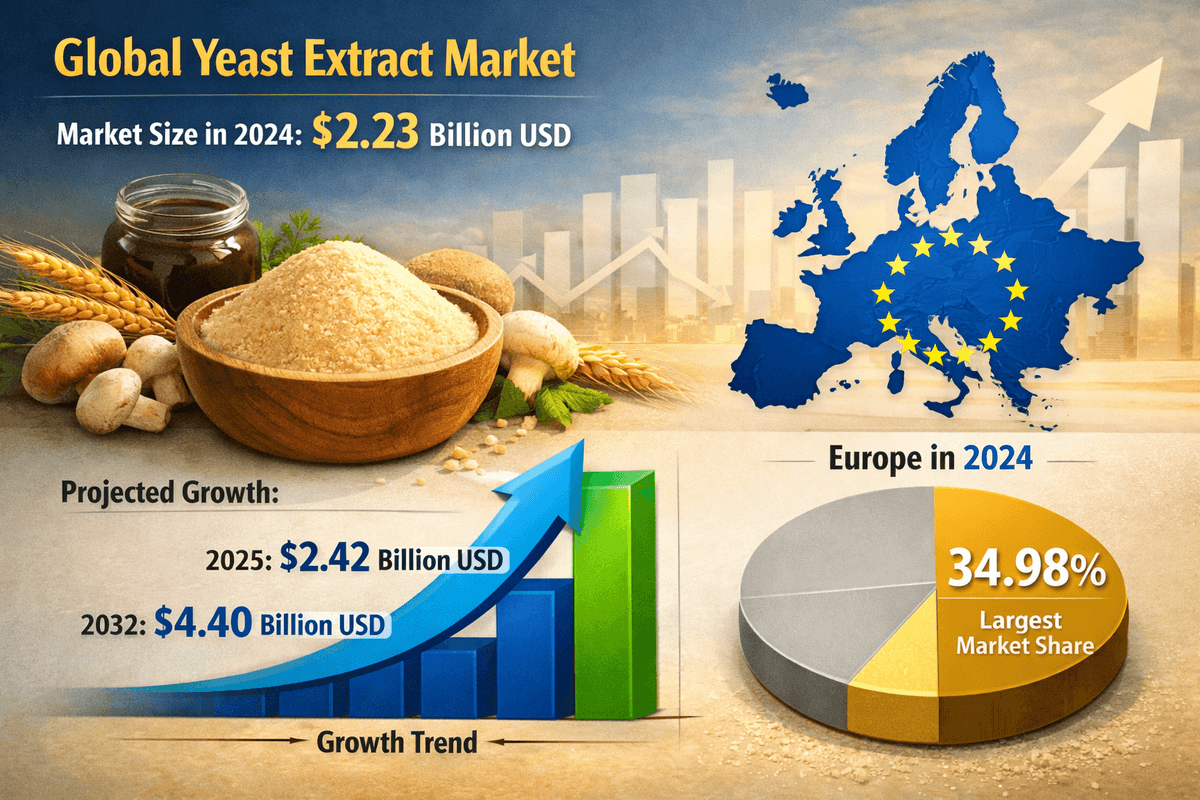 世界の 酵母エキス市場規模は、2024年に22億3,000万米ドルと評価されました。市場は2025年の24億2,000万米ドルから2032年までに44億米ドルに成長すると予測されており、2024年にはヨーロッパが34.98%の市場シェアで酵母エキス市場を支配しました。