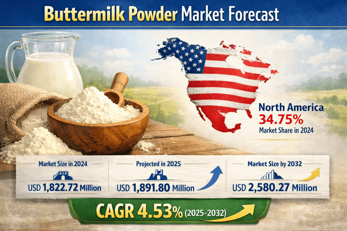 世界の バターミルクパウダー市場規模は、2024年には18億2,272万米ドルと推定されました。市場規模は2025年の18億9,180万米ドルから2032年には25億8,027万米ドルに拡大し、予測期間中に4.53%の年平均成長率(CAGR)で成長すると予測されています。北米は2024年には世界市場シェアの34.75%を占め、市場を牽引しました。