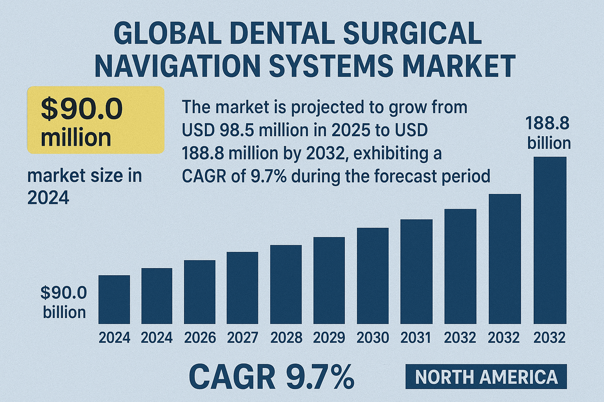 世界の 歯科手術ナビゲーションシステム市場規模は、2024年には9,000万米ドルと評価されました。市場は2025年の9,850万米ドルから2032年には1億8,880万米ドルに成長し、予測期間中に9.7%の年平均成長率(CAGR)を示すと予測されています。北米は2024年の歯科手術ナビゲーションシステム市場の47.33%のシェアを占め、市場をリードしました。