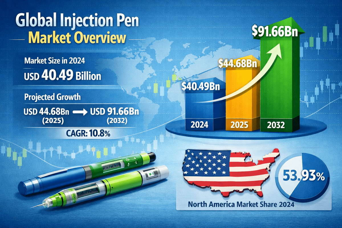 2026年の世界 注射ペン市場 規模は、2024年には404億9,000万米ドルと評価されました。市場規模は2025年の446億8,000万米ドルから2032年には916億6,000万米ドルに拡大し、予測期間中に年平均成長率(CAGR)10.8%で成長すると予測されています。北米は2024年の市場シェア53.93%で、注射ペン市場を牽引しました。